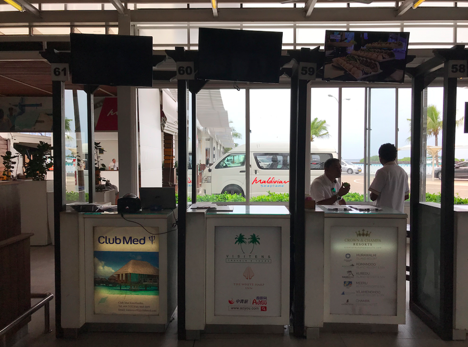 เมื่อเดินทางมาถึงสนามบิน Velena หรือที่รู้จักกันในชื่อสนามบินมาเล่และและผ่านพิธีการตรวจคนเข้าเมือง รับกระเป๋าและเดินออกมาจากสนามบินเรียบร้อยแล้ว ท่านจะพบกับเจ้าหน้าที่ของรีสอร์ทต่างๆมาคอยต้อนรับ ท่านสามารถมองหาเจ้าหน้าที่ที่ถือป้าย HURAWALHI MALDIVES RESORT หรือหากไม่พบเจ้าหน้าที่ สามารถเดินไปยังcounter no. 59 เพื่อเช็ครายชื่อผู้เข้าพัก เจ้าหน้าที่ของรีสอร์ทจะผูก Tag ที่กระเป๋าและพาท่านไปยัง counter seaplane ซึ่งอยู่ภายในสนามบินเพื่อทำการเช็คอินต่อไป