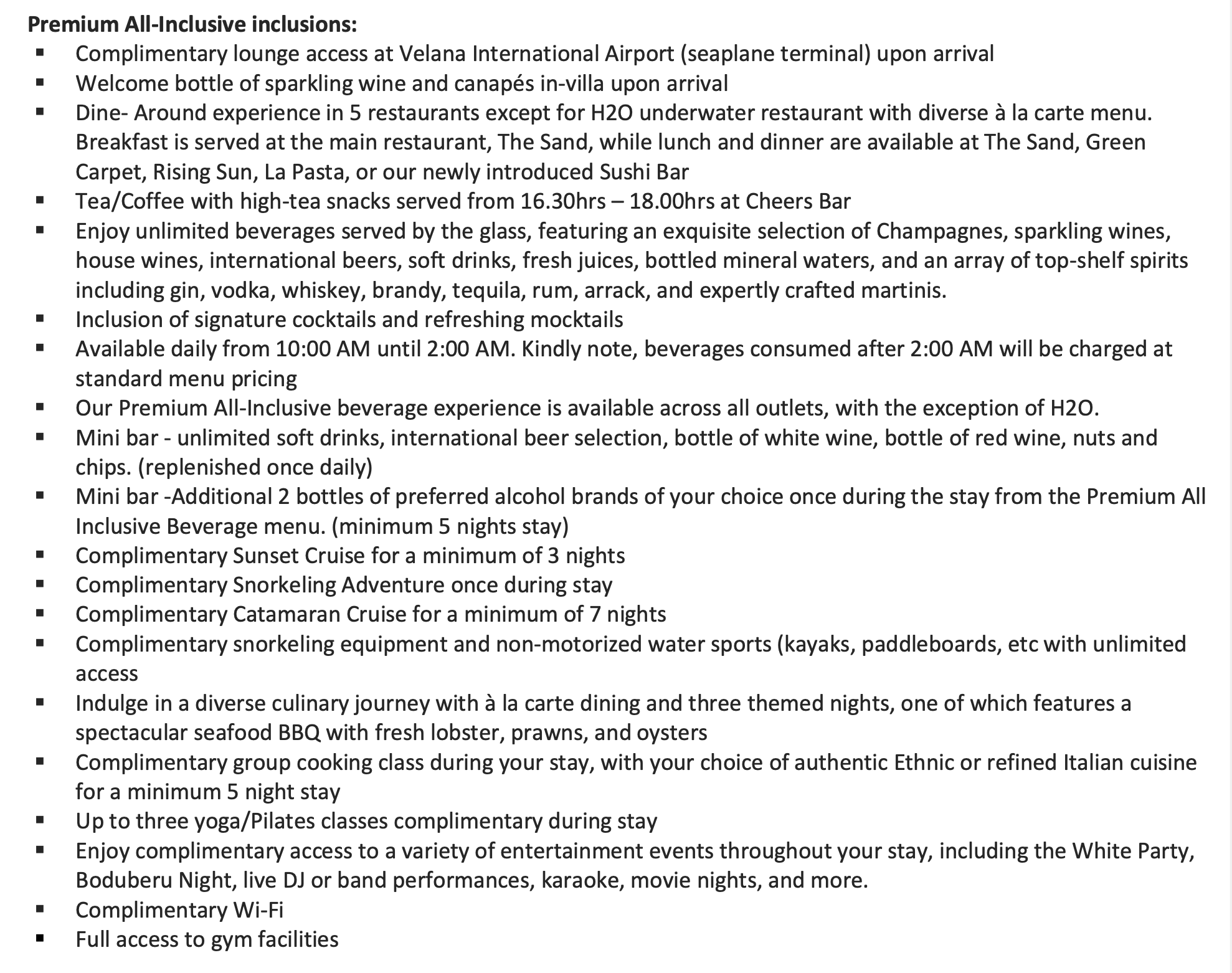 ให้บริการแบบ Premium All Inclusive ที่รวมให้ทุกอย่าง ตั้งแต่อาหาร 3 มื้อต่อวัน, เครื่องดื่มแบบมีและไม่มีแอลกอฮอลล์ที่บาร์, มินิบาร์ที่ห้องพักและอุปกรณ์ดำน้ำตื้น, คายัค, Stand up Paddle Board