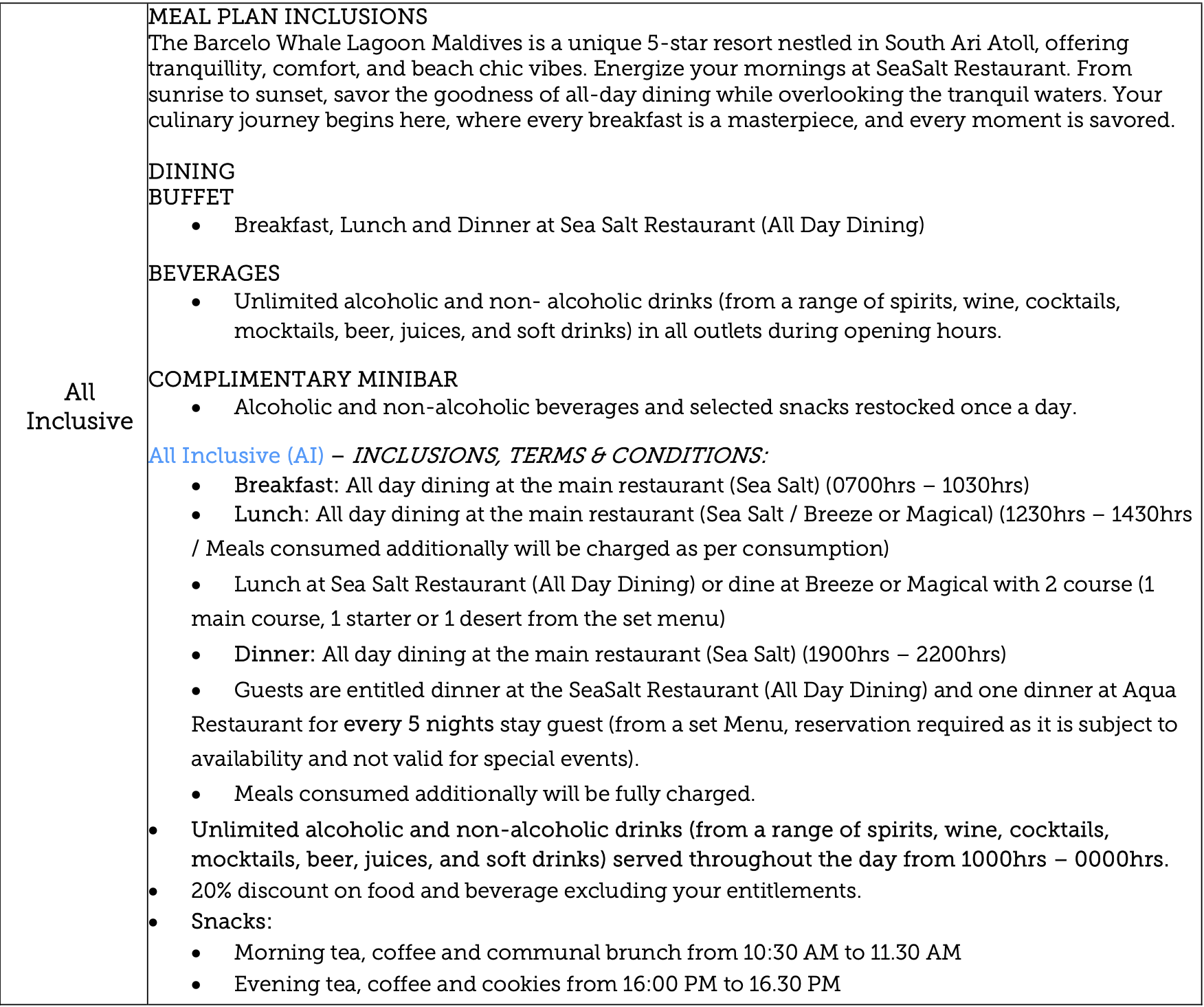 - อาหารและเครื่องดื่มทุกมื้อ (รวมเครื่องดื่มที่มีและไม่มีแอลกอฮอล์) รายละเอียดด้านล่าง/ All Inclusive Meal Plan: including alcoholic & non-alcoholic beverages (Detail is below)