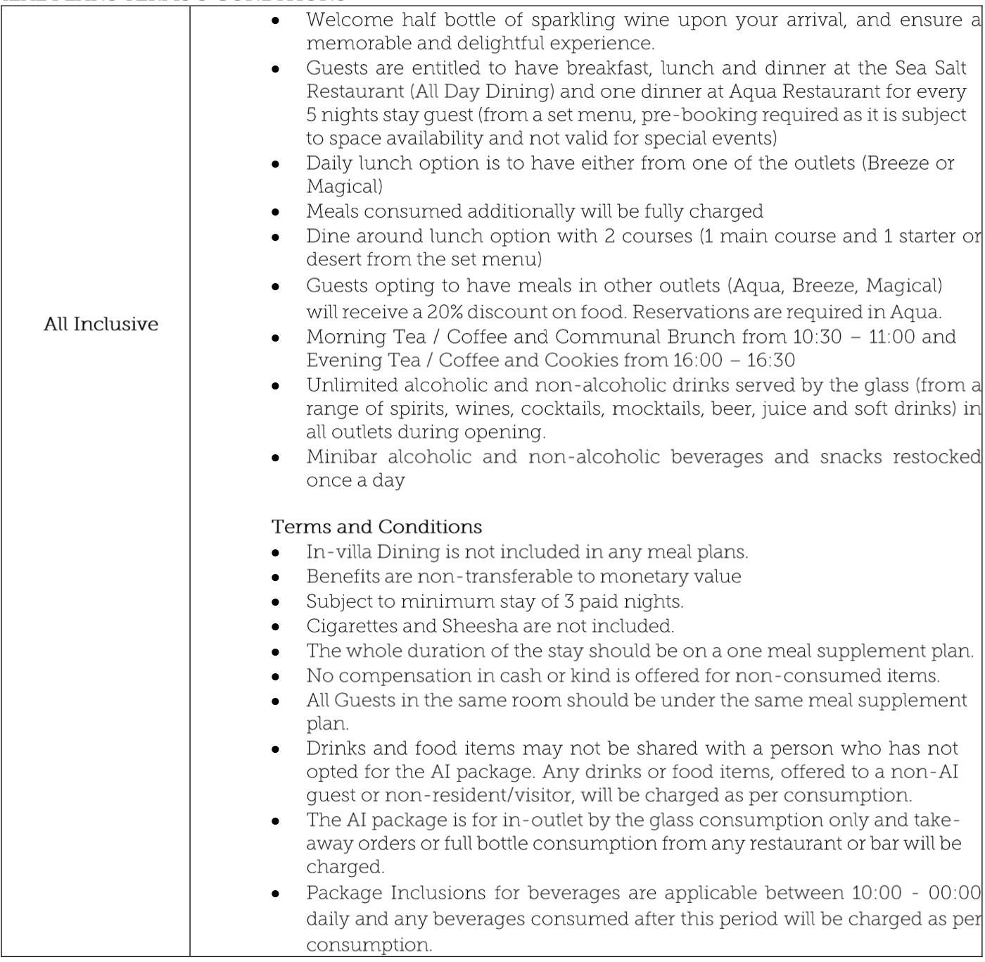 - SPA Credit Voucher of USD 50/couple ONCE during their stay. Booking should be for couples’ treatments with a minimum of 80 mins duration (option nontransferable or convert into cash). Excludes Retail, terms and Conditions apply)